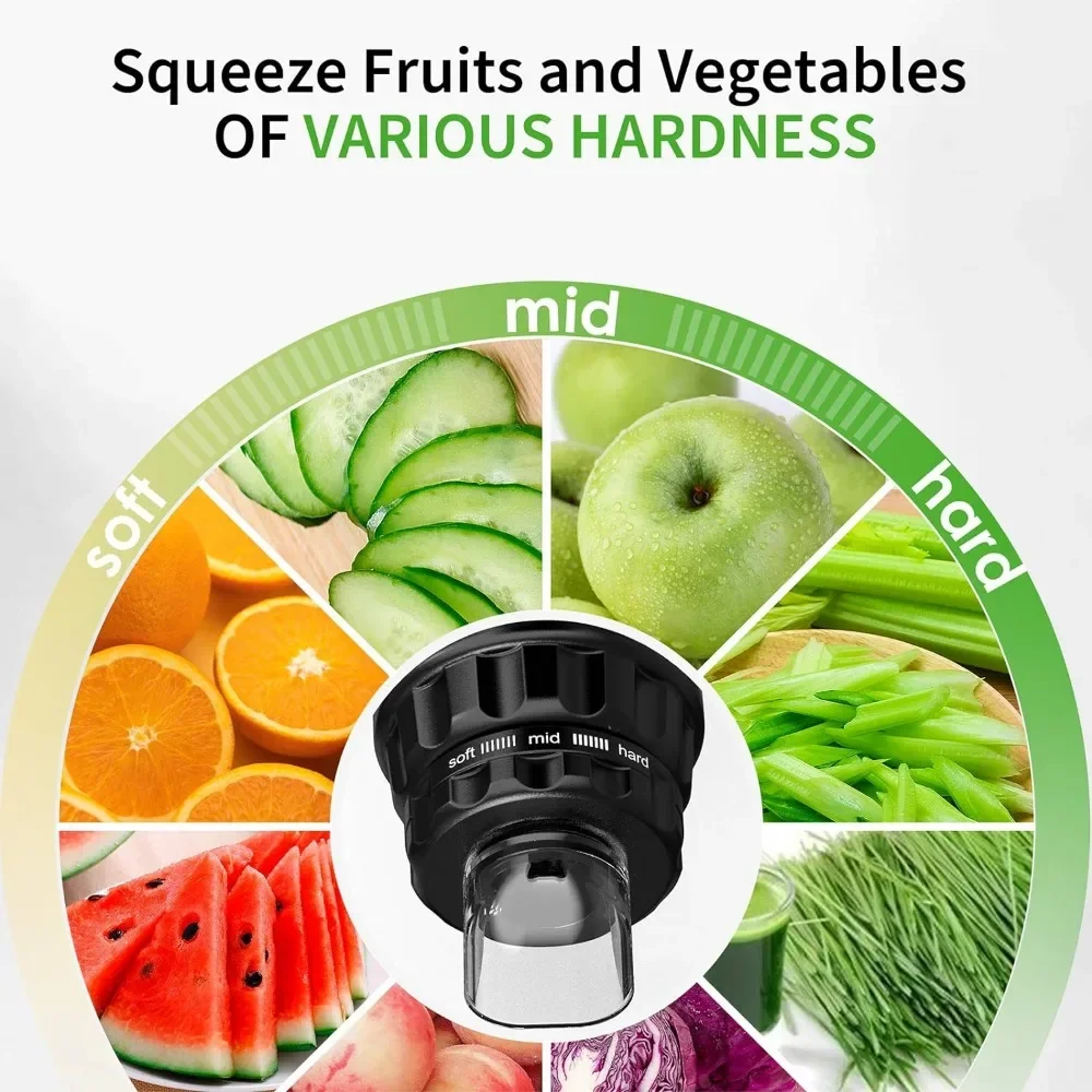 - More Different Tastes and Textures of Juice – Adjustable ring with 3 modes (soft/medium/hard) can help make juice with different textures. You can choose the “hard” mode for pure juice or the “soft” mode for juice with little soft pulp according to your preferences.